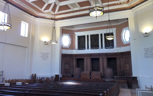 oak pews and 2 parapets. The auditorium is surrounded by