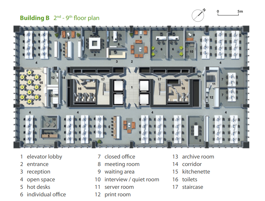 Business Garden Bucharest – Building B stands out with a total surface of 10,781 m² and delivers high-quality office space that blends functional efficiency with superior indoor comfort. Designed with sustainability and wellbeing in mind, it offers abundant natural light, advanced technical solutions, and seamless access to the full range of campus amenities.